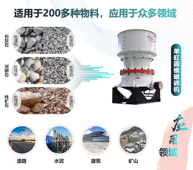 單缸圓錐破碎機分為標準型和短頭型,分別應用于中碎和細碎作業(yè),廣泛應用于冶金、建筑、公路、化工、建材工業(yè)中,適于破碎高硬度和高磨蝕性的礦石及巖石。尤其在金屬礦和建筑砂石料的破碎方面應用更廣泛。