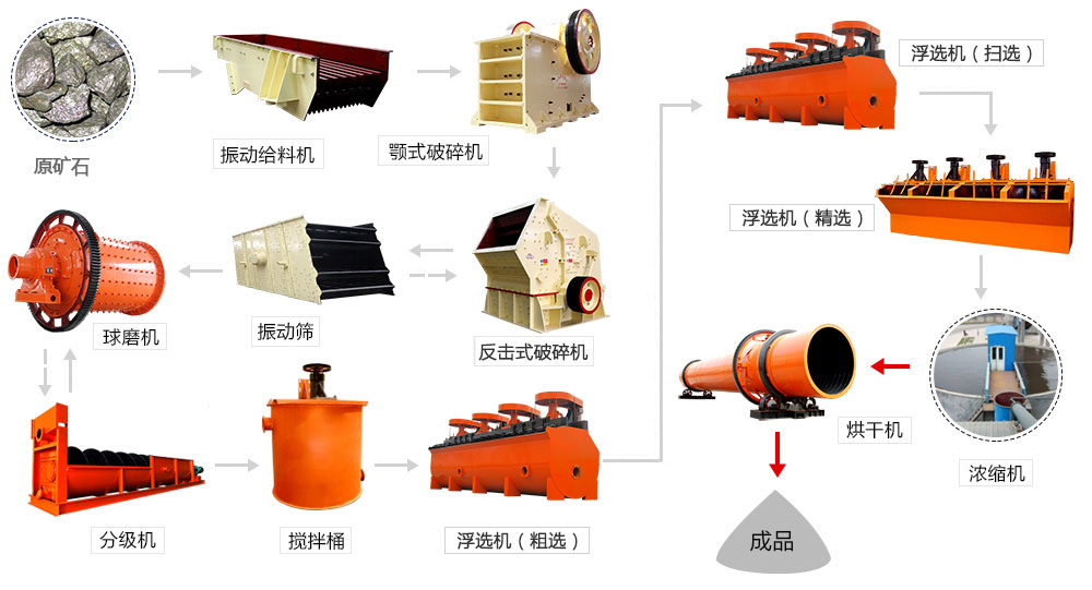 浮選工藝流程由顎式破碎機(jī)、反擊式破碎機(jī)、球磨機(jī)、分級(jí)機(jī)、攪拌桶、浮選機(jī)、濃縮機(jī)和烘干機(jī)等主要設(shè)備,配合給礦機(jī)、提升機(jī)、皮帶輸送機(jī)可組成完整的選礦生產(chǎn)線。該生產(chǎn)線具有高產(chǎn)、低能、處理量高、經(jīng)濟(jì)合理等優(yōu)點(diǎn)。